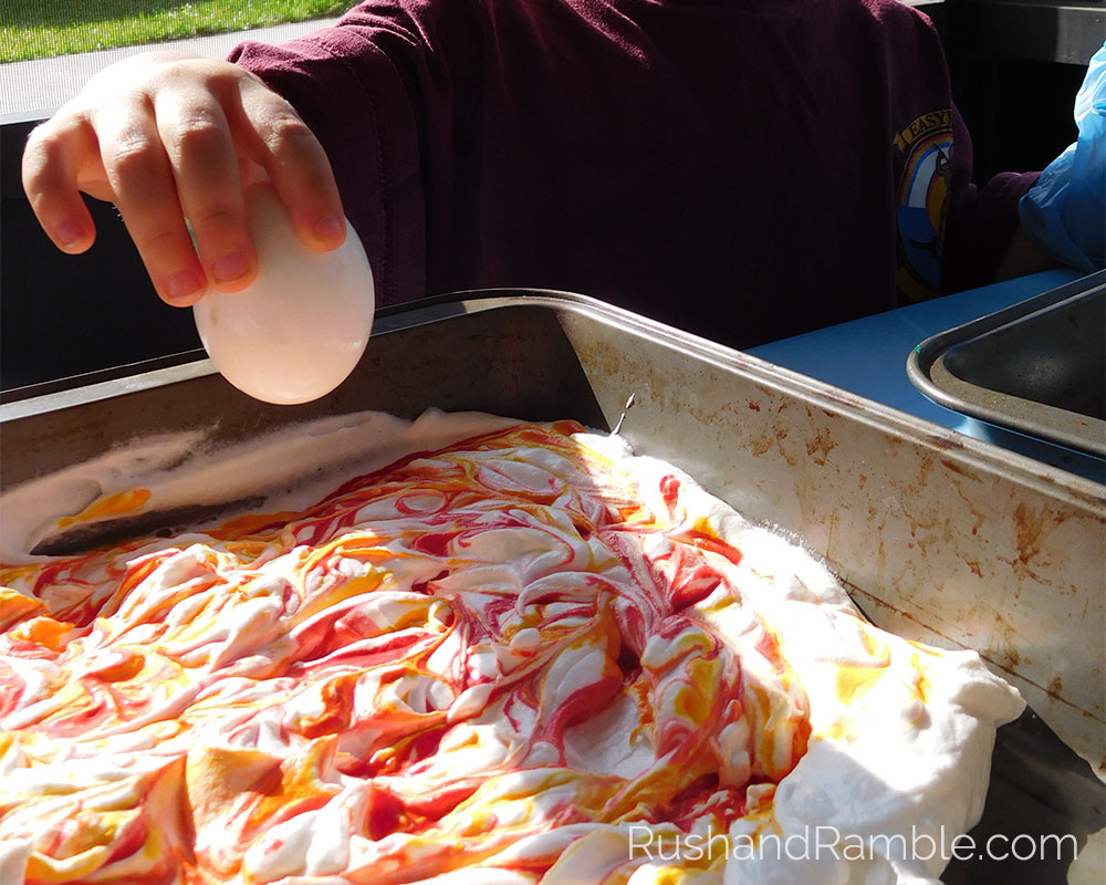 Once your pans are prepped, I’d suggest putting gloves on and moving outside for the remainder of the project. It’s fun, but messy. Place the eggs on the cool whip and roll them around. You can do this one at a time or put a bunch in at once and go nuts. Just make sure you thoroughly coat each eggs with dye and whip.