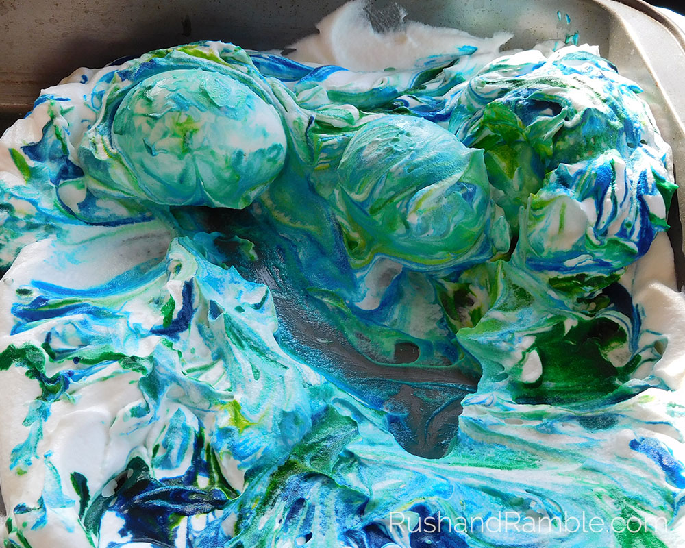 I put rubber gloves on him to minimize the staining; I didn’t feel like having to explain to his teachers why he suddenly became a smurf over night. This resulted in him flinging his hands around a bit and cool whip and dye splattering on a few different surfaces. Pro tip – do this one outside and plan ahead so you have kid sized gloves.