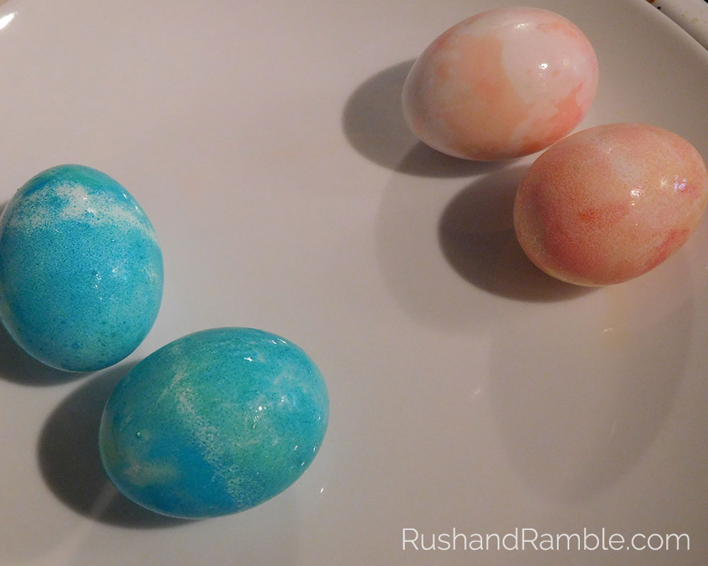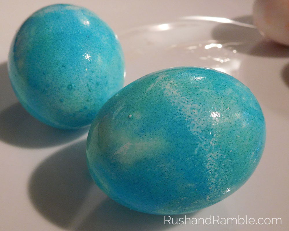 As for the coloring? I was a little disappointed at first. The red and yellow didn’t seem to set well. I was ready to call this one a fail until I rinsed the first blue and green egg. The colors were vibrant and swirled nicely. I’d say this one is best done with rich, dark colors and if you choose to use yellows or pinks, make sure you add extra food coloring.