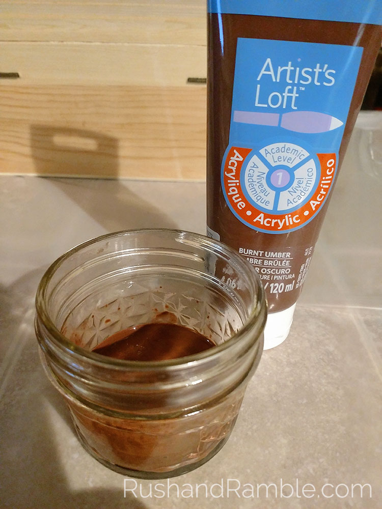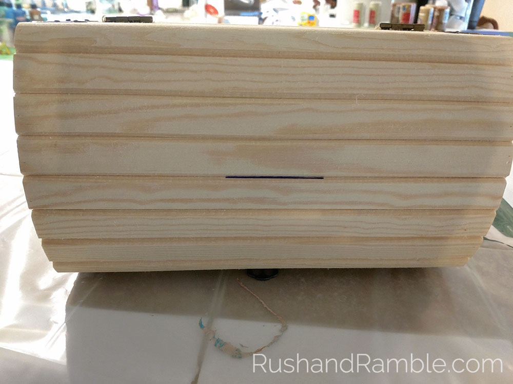 Next I stained the box. To do this, I watered down some brown acrylic paint until it was as thin as wood stain. When possible, I prefer staining wood with acrylic paint. This way I can work inside in the air conditioning and the cleanup is much easier. It also means fewer chemicals lingering on the surface and a quicker dry time so I could get to the next step of personalizing the treasure chest.