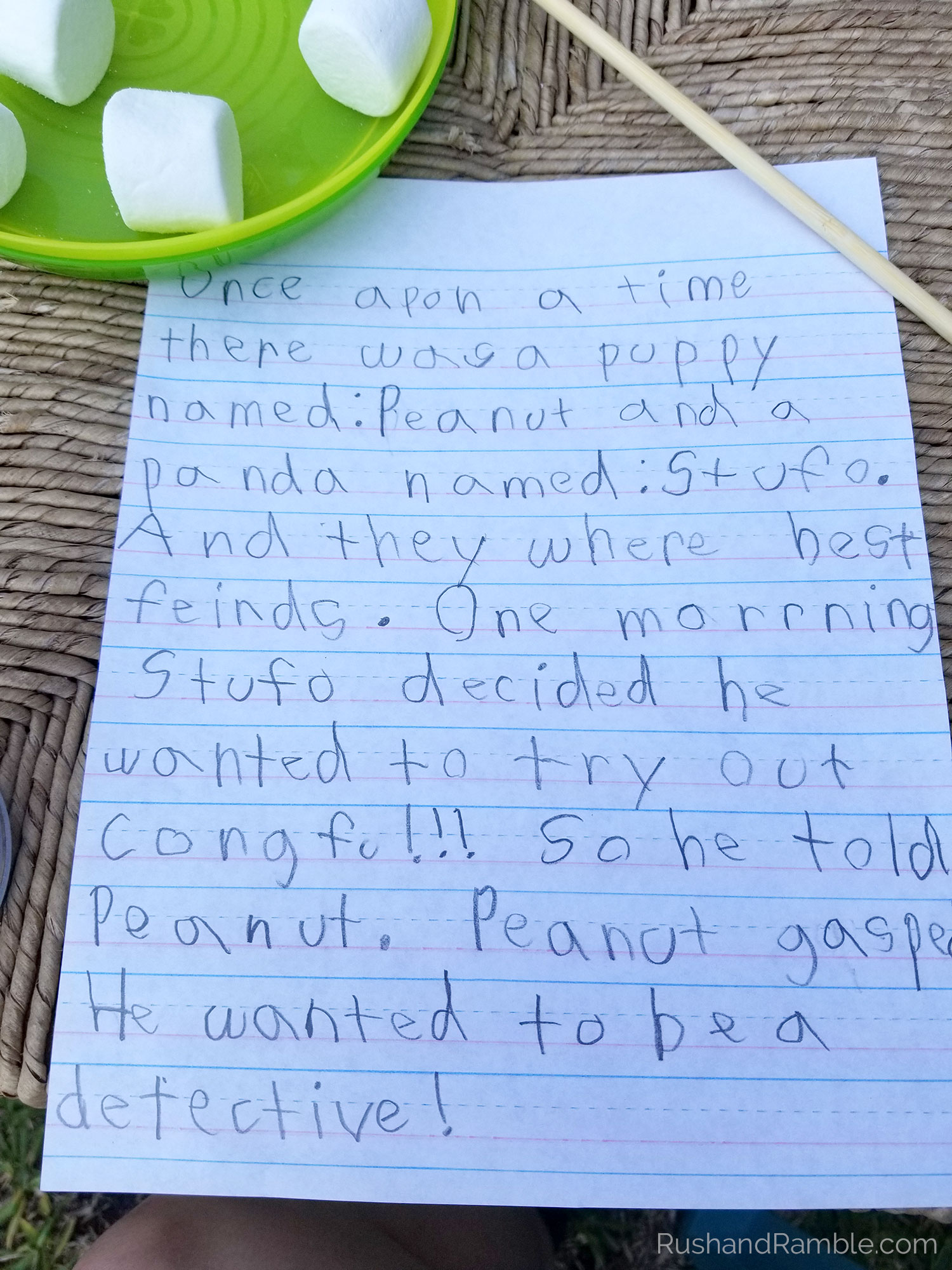 What better way to finish up a day at camp than beside a campfire roasting hot dogs and marshmallows. I even managed to squeeze in a short writing assignment by asking the little guy to write a story to read by the campfire. He LOVED the idea of campfire stories so much, he had no problem practicing his handwriting.