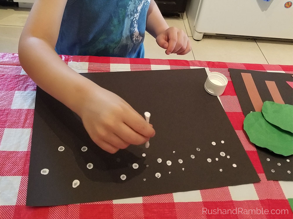 First, use the Q tip and white paint to add stars to your night sky. While that is drying, cut out green circles for your tree tops and brown rectangles for your tree trunks. Crumple up the green circles to give them texture. Cut a large blue triangle for your tent. Make a small 1 to 2 inch cut in the middle of one side of the triangle. Fold these pieces back to make your tent flaps. Use a scrap of paper in a different color to put behind your tend flaps. Finally, cut some small brown rectangles for your firewood.