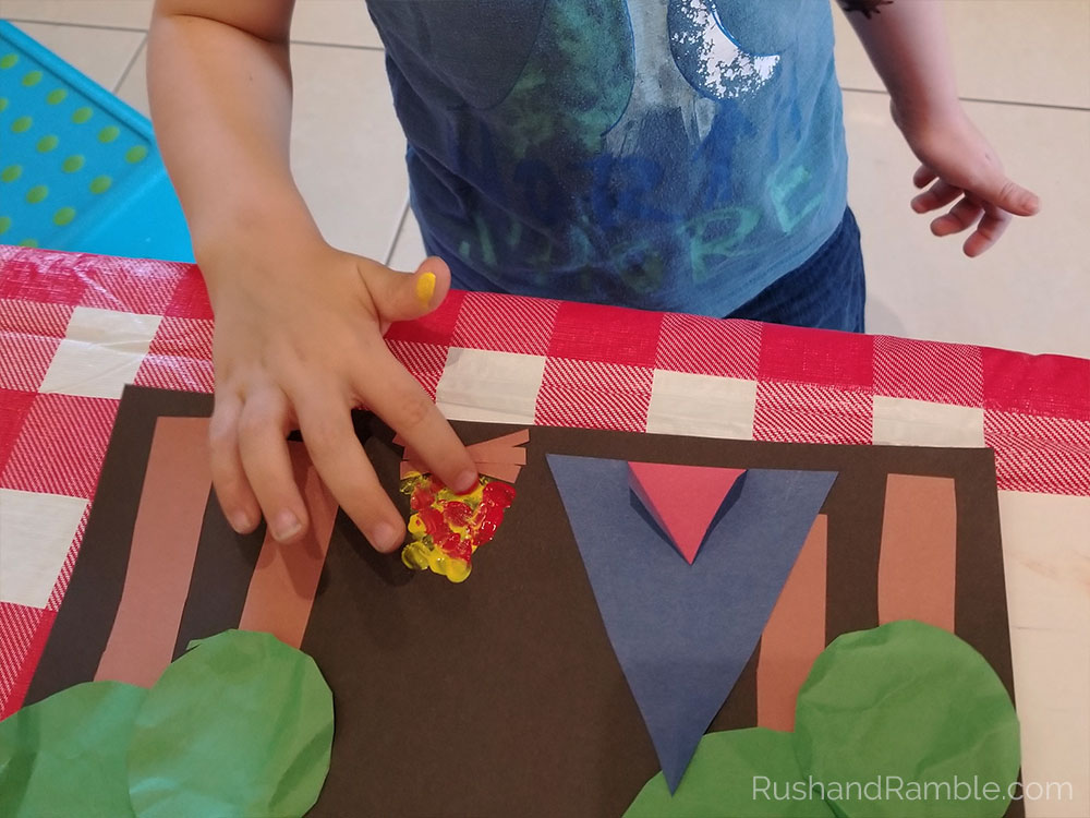 When you are done cutting, lay out all your pieces on the black background to decide where they will all go. Glue the tree trunks down first, then add the green tree tops. Next, glue your scrap paper to the back of your tent and trim it down if needed. Glue the tent and the campfire logs to the black paper. Using one finger, paint the fire on top of the campfire logs. Alternate using yellow and red to get a fun mix of colors.