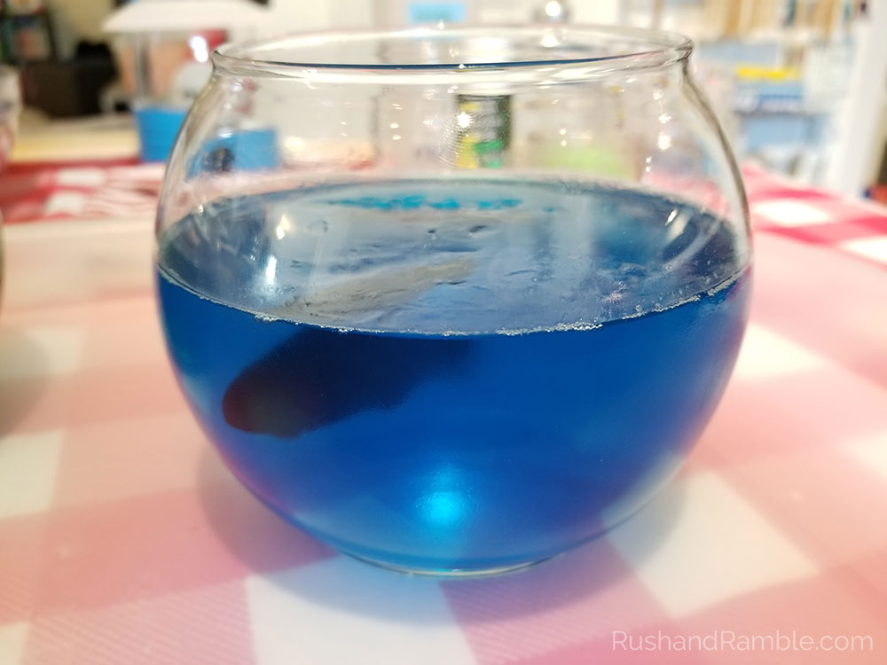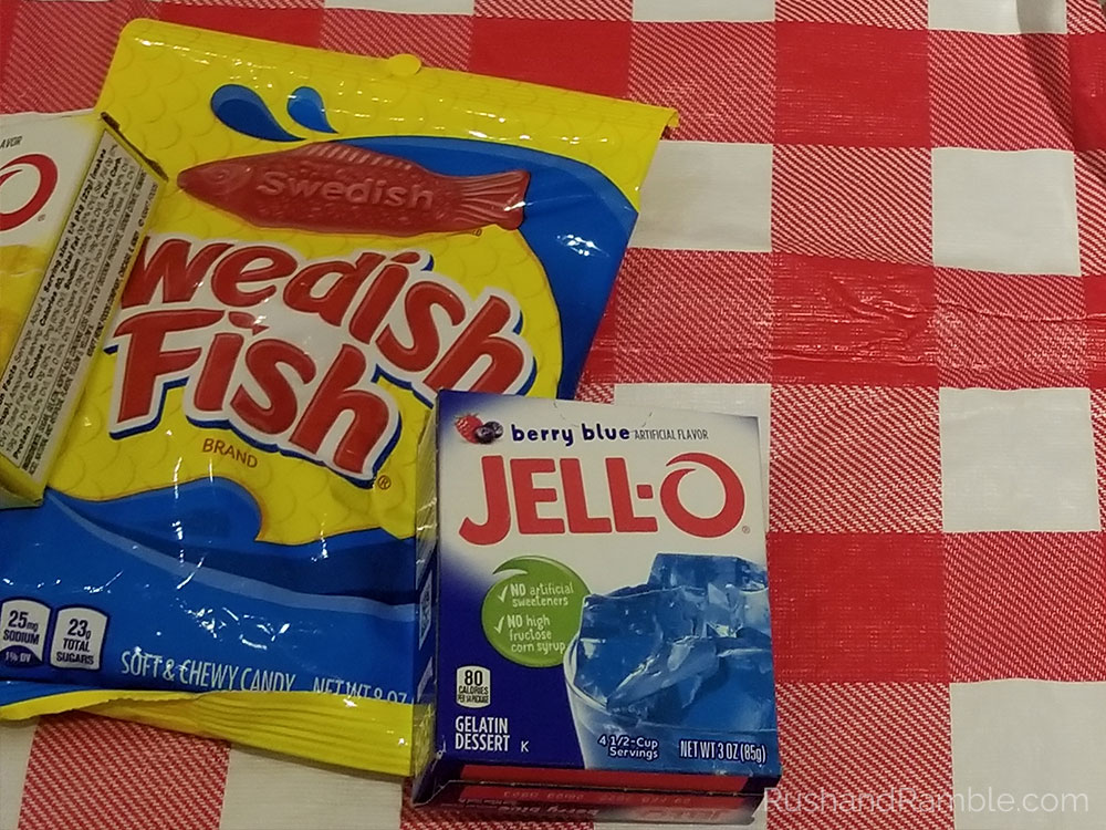 Mix the blue Jello following the instructions on the packet. We used the quick set method to speed things along. Pour the Jello mixture into the glass bowl. Let set in the fridge for 30 minutes to 1 hour. Once the Jello has started to get firm, push the Swedish Fish into the Jello. We used toothpicks to help with this. If the Jello is too firm, you can use a knife to make an incision about 1.5 inches long and then push the fish in.
