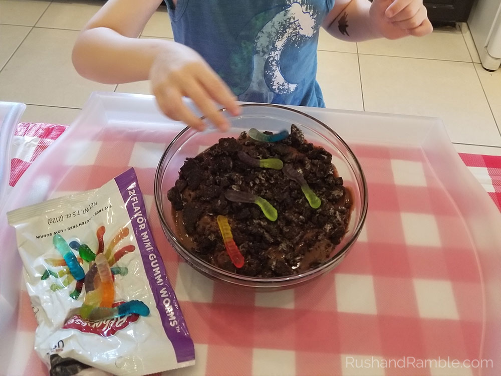 Mix the pudding according to the package instructions. Or toss the pudding mix and milk in a large mason jar and shake (that’s what we did). Once the pudding is thoroughly mixed, dump it in a large bowl. Using a large spoon, smack some Oreos to make cookie crumbles. You can also use a small hammer to speed things up. Dump the Oreo cookie crumbles on top of the pudding and spread them around. Top it off with some gummy worms. Place your mud mix in the fridge for at least 30 minutes to chill before serving.