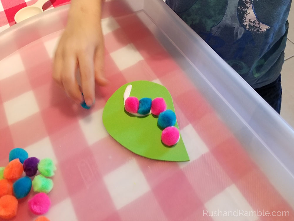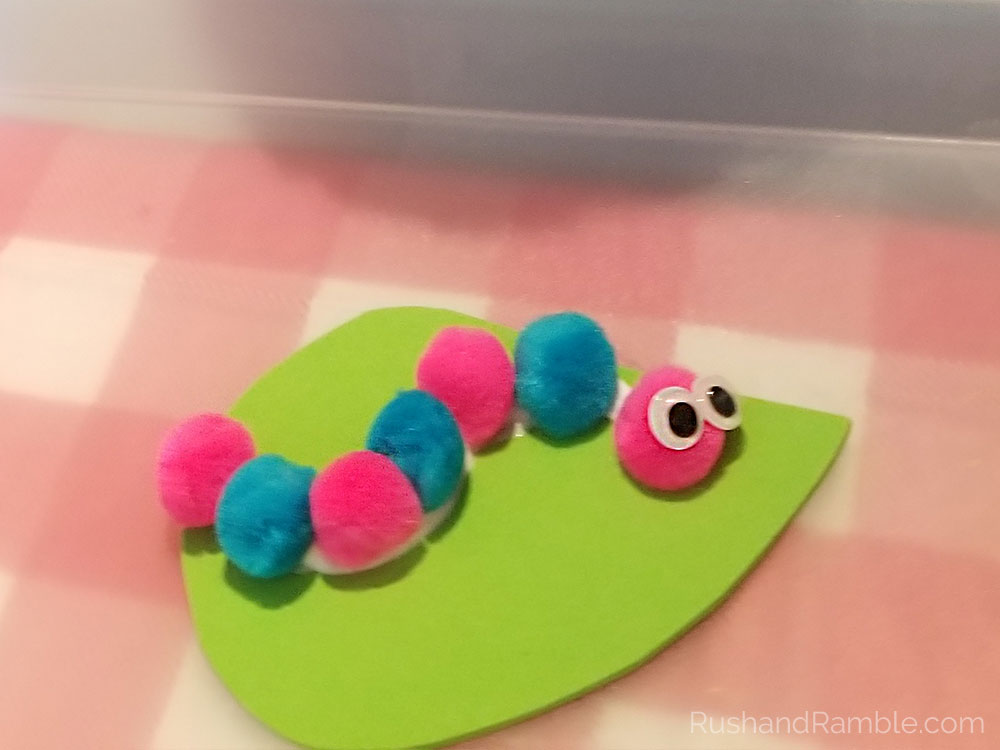 Cut out a leaf shape piece of foam. Lay out your pompoms on the leaf to see which colors and how many you want to use and where you would like to put them. Move the pompoms off the leaf and draw a line of glue where your caterpillar will go. Place the pompoms on the glue line one puff ball at a time. Add more glue as needed. Lastly, add two googly eyes to the pompom that will be the caterpillars head.